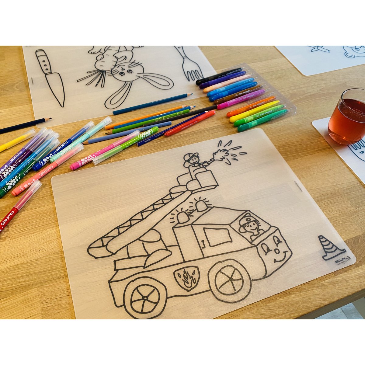 🖍️ Herkleurbare placemats – Voertuigen pakket met 3 placemats + stiften 🍽️🎨